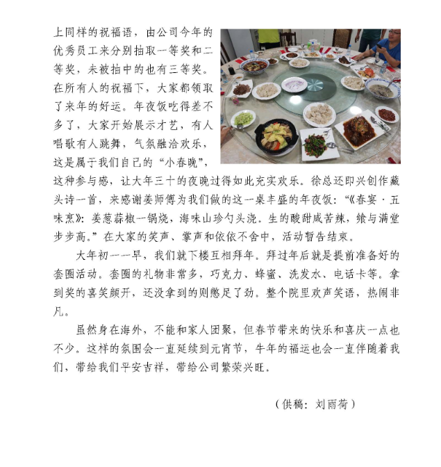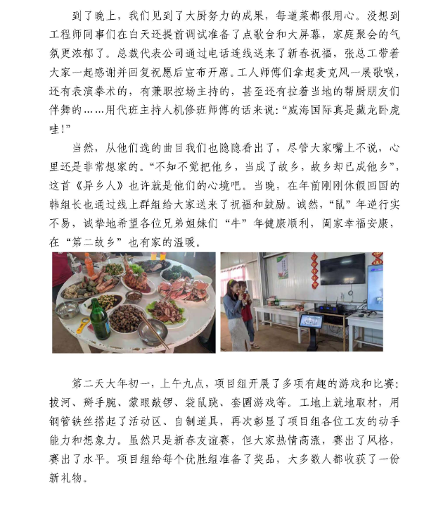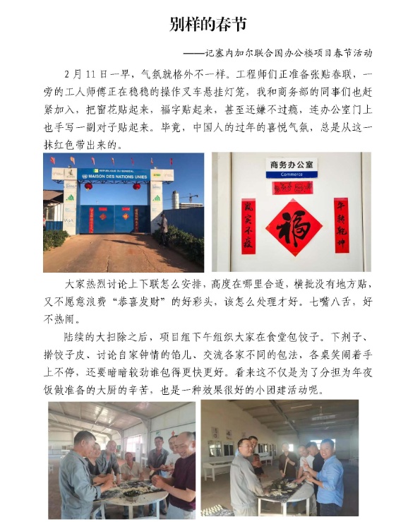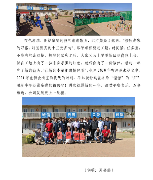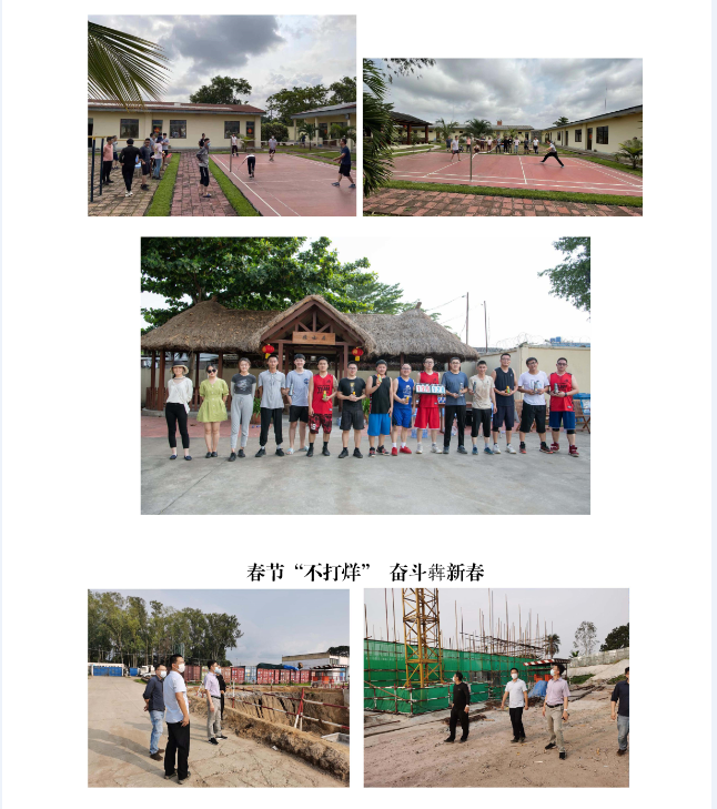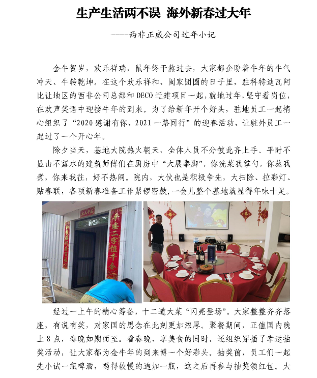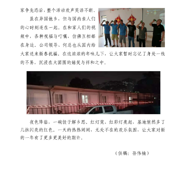 春節(jié)期間,公司駐外員工堅(jiān)守一線,30多個(gè)工程項(xiàng)目仍在有序推進(jìn),800多名建設(shè)者們把工地當(dāng)家,在異國(guó)它鄉(xiāng)的平凡崗位上書寫不凡。當(dāng)然,在這個(gè)全球華人同喜共慶的歡樂時(shí)刻,大家也不忘貼對(duì)聯(lián)、掛燈籠、畫年畫,聚在一起吃頓熱騰騰的年夜飯,其樂融融地觀看春晚。有的項(xiàng)目組還給大家準(zhǔn)備了新春禮物,有的舉辦了趣味盎然的慶?;顒?dòng)······。下面,就讓我們一起來感受一下他們的別樣“年味”。