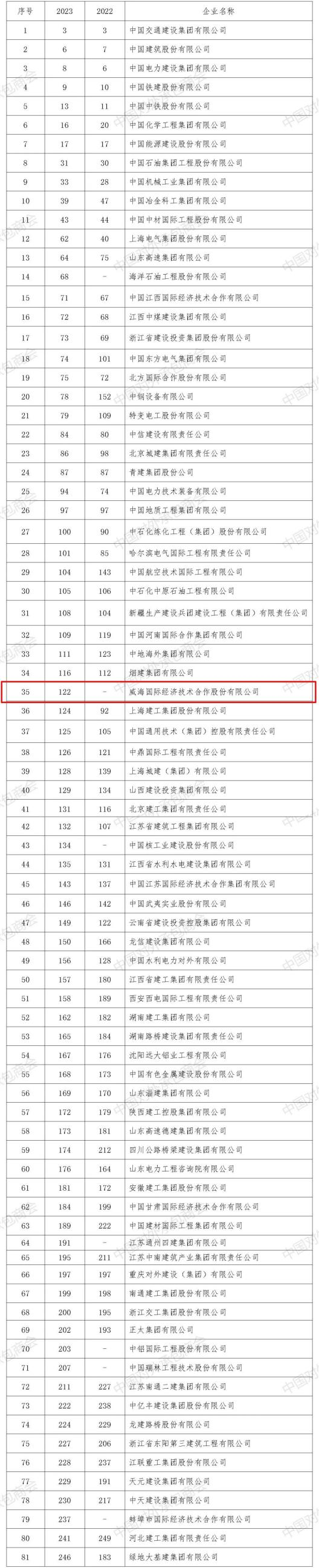 On August 23, Engineering News Record (ENR)’s 2023 Top 250 International Contractors was released. Our company has once again made the list, ranking 122nd overall and 35th among Chinese enterprises on the list.