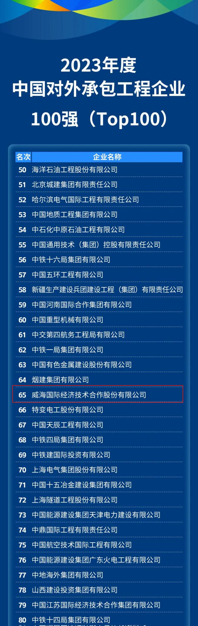 On May 7, during the 2024 China International Contracting Conference & Development Forum, China International Contractors Association released several rankings of China’s international contracting enterprises in 2023. Weihai International Economic & Technical Cooperative Co., Ltd (WIETC) was successfully listed among the Top 100 International Contracting Enterprises, the Top 30 Housing Construction Enterprises and the Top 30 Enterprises for Africa Business, ranking 65th, 25th and 25th respectively, which once again reflects the company's growing strength in overseas development.China's top 100 international contracting enterprises