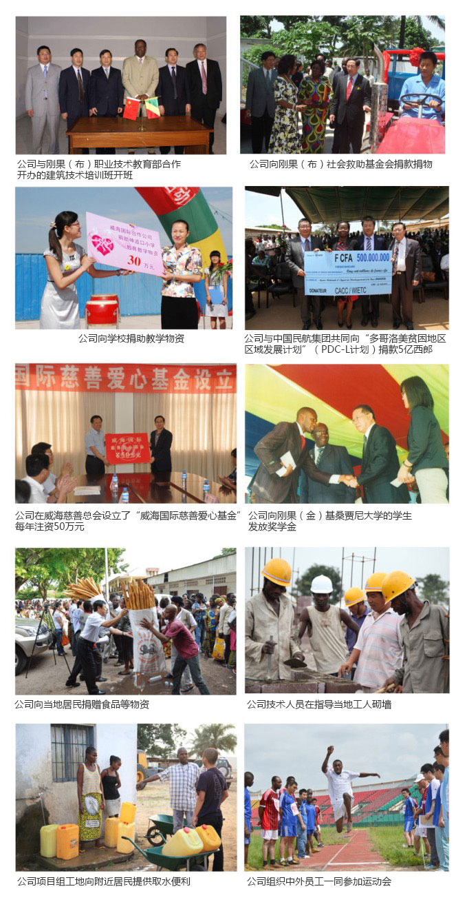 La société réagit activement au travail charitable: en Chine elle soutient pendant longtemps l'école primaire et collège de Shendaokou à Weihai, the Shandong Jianzhu University, la Maison des Enfants de Weihai, le développement communautaire, à travers la donation de fond et des articles, l'offre des bourses et des installations etc. Elle établit la Fondation Internationale de Coeur à l'institut général philanthropique de Weihai, fondation la plus importante parmi toutes celles titrées dans cet établissement, y met 500 milles RMB de somme annuelle minimale. A l'étranger, elle finance pendant longtemps de différents organismes de secours, des écoles, des équipes nationales, en particulier fait tout son possible pour assister aux aides au cas des catastrophes et movements sociaux. Elle a prêté des moyens à la réparation des routes pour peuple local, à l'approvisionnement de l'eau et d'électricité, à la construction des infrastructures municipales etc. Les succursales locales devant chaque année déclairer la liste et le planning de s'acquitter à la responsabilité sociale et compatible à la réalité locale en définissant les différentes actions de soin est notre régime. La somme totale investie par WIETC dans les activités charitables a dépassé 10 millions RMB.