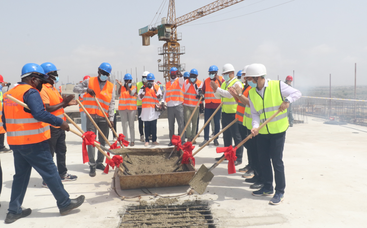 Le 15 juillet 2021 à 11h38, avec la dernière injection de béton sur la toiture de l'étage R+7 de la zone 2 du batiment C, la mise en place du couronnement du projet de batiment de bureau de l'Organisation des Nations Unies au Sénégal a été effectuée favorablement. Les pétards ont éclaté ensemble sur site du projet avec la salve d'applaudissements, les acclamations des employés chinois et sénégalais duraient longtemps. Le Président du conseil d'administration et le Président-directeur général de la Société ZHANG Shicheng, le Président du conseil d'administration TALL et le Directeur général Thiam du partenaire, le Directeur général adjoint de SZTC en Afrique de l’Ouest SUN Jianli, le Directeur général adjoint de SZTC au Sénégal QI Pan, le Directeur d'équipe de projet HAN Shaobo et tous les membres de l'équipe de projet ont participé à la cérémonie de mise en place du couronnement.
