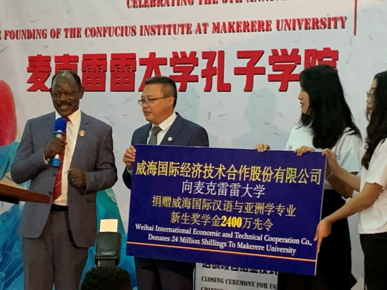 11月23日,為響應(yīng)威海國際公司2019年“筑夢未來—教育公益行動”的倡議,烏干達(dá)正威公司向?yàn)醺蛇_(dá)麥克雷雷大學(xué)孔子學(xué)院捐贈獎學(xué)金2400萬先令,約合人民幣46000元,用以獎勵15名漢語與亞洲學(xué)專業(yè)的新生。