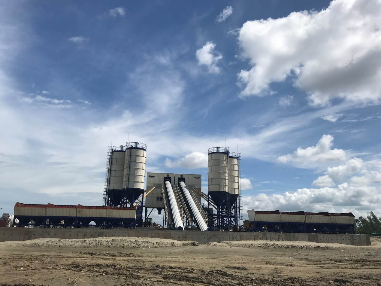該項目自2018年1月19日正式開工,短短四個多月時間,項目組在沒水、沒電、沒路的蠻荒海邊,在只有一名管理人員、9名中國技術(shù)工人、所有大型機械設(shè)備全部當(dāng)?shù)刈赓U的情況下,以敢打硬仗、能打硬仗的精神,群策群力、眾志成城,相繼完成了1200噸水泥存儲量砼攪拌樓的基礎(chǔ)、組裝、吊裝、調(diào)試,1800余米臨時進場道路,1000余米高壓輸電線路,350平方米檢測辦公室,2500多平方米業(yè)主臨時生活區(qū),500千瓦發(fā)電機及變電站基礎(chǔ)制作、架設(shè)、安裝、調(diào)試及圍欄工程,兩口每小時流量達30立方的深水井等施工任務(wù),硬是讓這里通上了水、電、路,建成了大型攪拌站、生活區(qū)及辦公室。